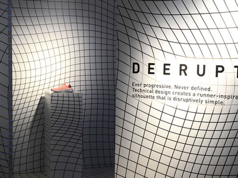 Projected onto two principal walls using ultra short throw projectors, a grid-wrapped enclosed space was created, inside which a Deerupt shoe was displayed. RFID tracking technology disguised within the runner allowed customers to ‘disturb the grid’ by lifting the shoe from the plinth. Doing so created an interactive spectacle as the projected mesh warped in unison and transformed in colour with the shoe’s every movement.