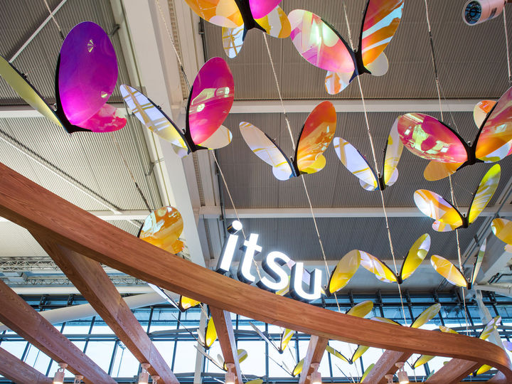 Playing on Itsu’s core brand icon – the butterfly – the lighting feature captivates audiences with an impressive presence, creating a visual identity that renders the restaurant instantly recognisable upon entering the terminal.
