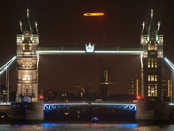One of the largest and brightest man-made structures to ever fly over a capital city, the 'Halo 4' glyph symbol measured a colossal 50 feet in diameter, weighted over 3.2 tonnes, and was illuminated by 20 kW of pure orange LED light.