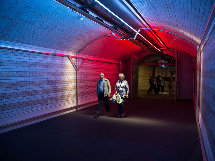 This experimental interactive lighting design project created a band of white light which physically followed the visitor, forming a bright line of light tracking his/her journey. As one person passed, the white light jumped to the next arrival. Either side of the white band, washes of strong colour were pushed and pulled along the tunnel, creating an ambient lighting effect that represented the overall ebb and flow of the traversing visitors. Throughout the day, these colours shifted in hue and saturation, as they responded to the prevailing direction of the crowds’ movement.